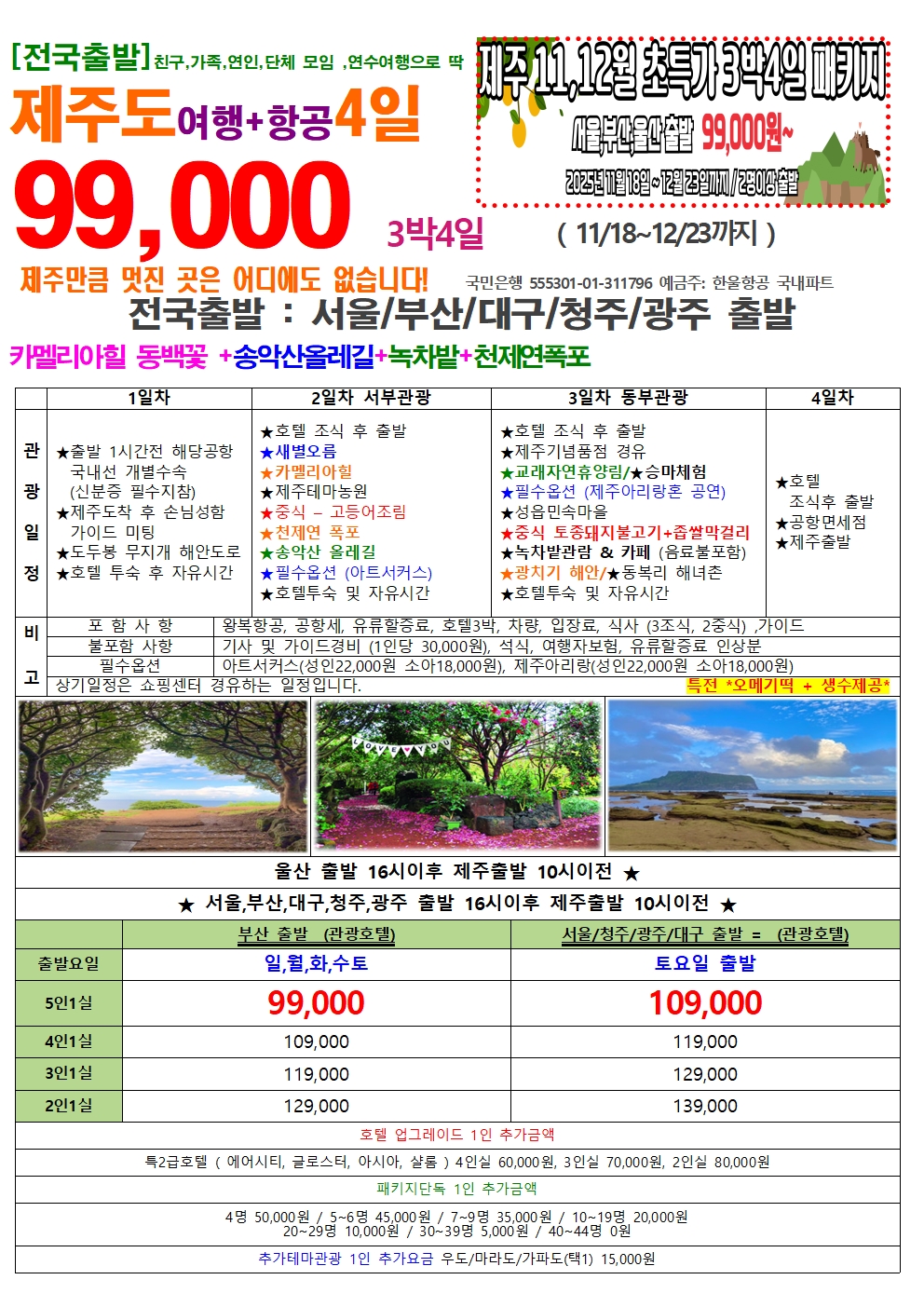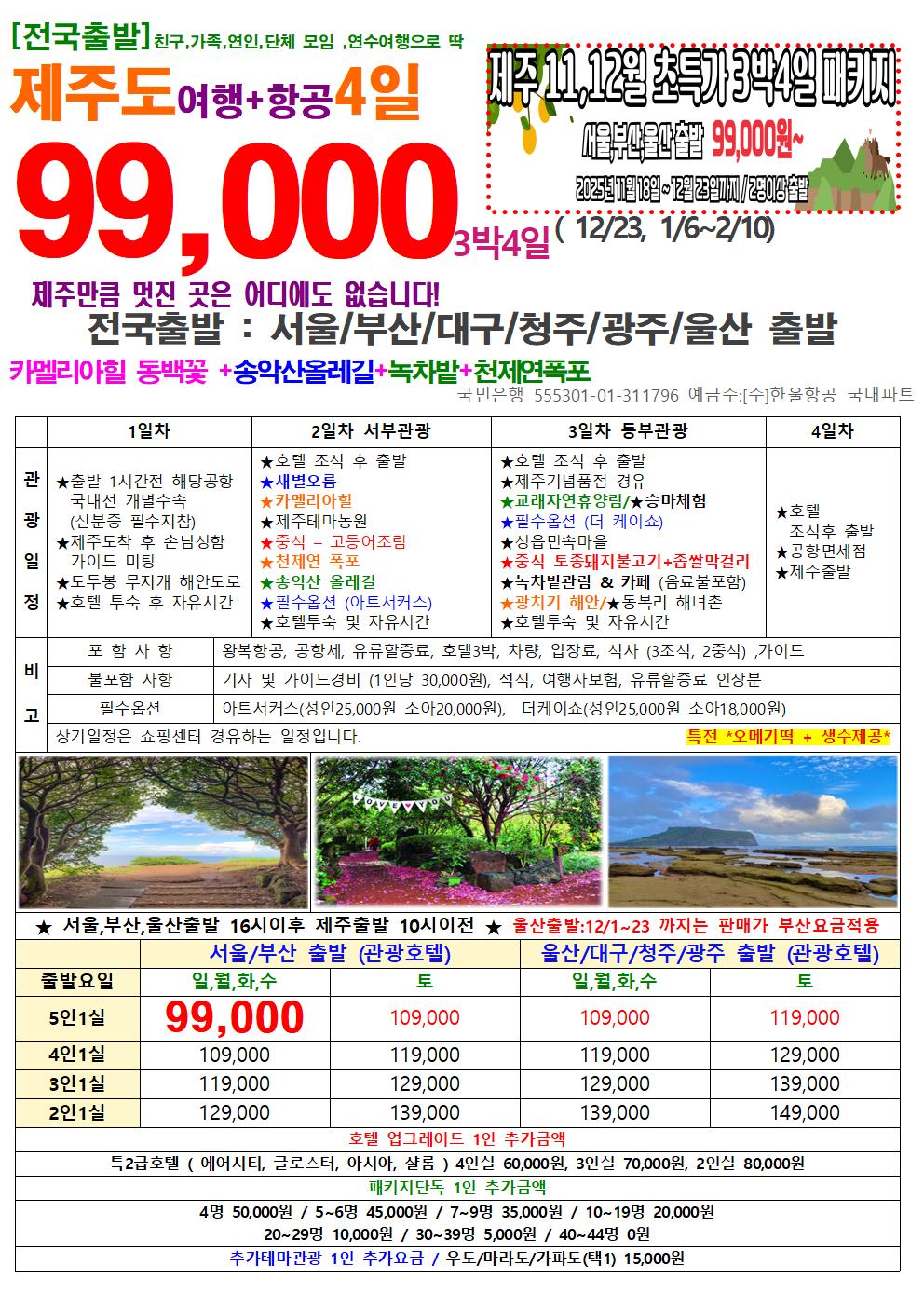 [전국 출발] 제주도 초초특가 3박 4일 즐겁게 제주도 생활을 느껴보시면 어떨까요? 99,000원 상품