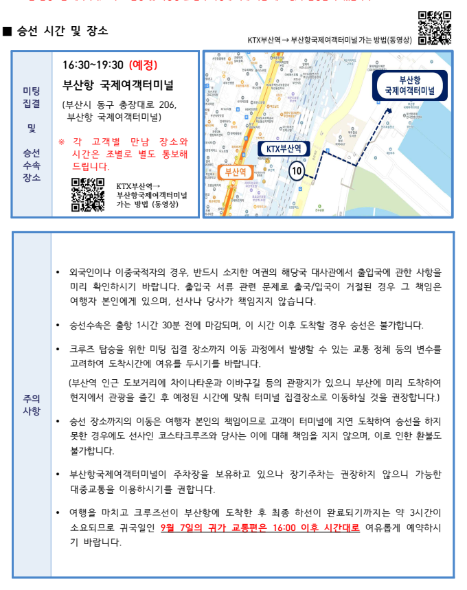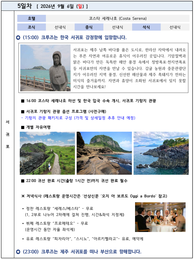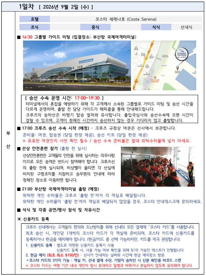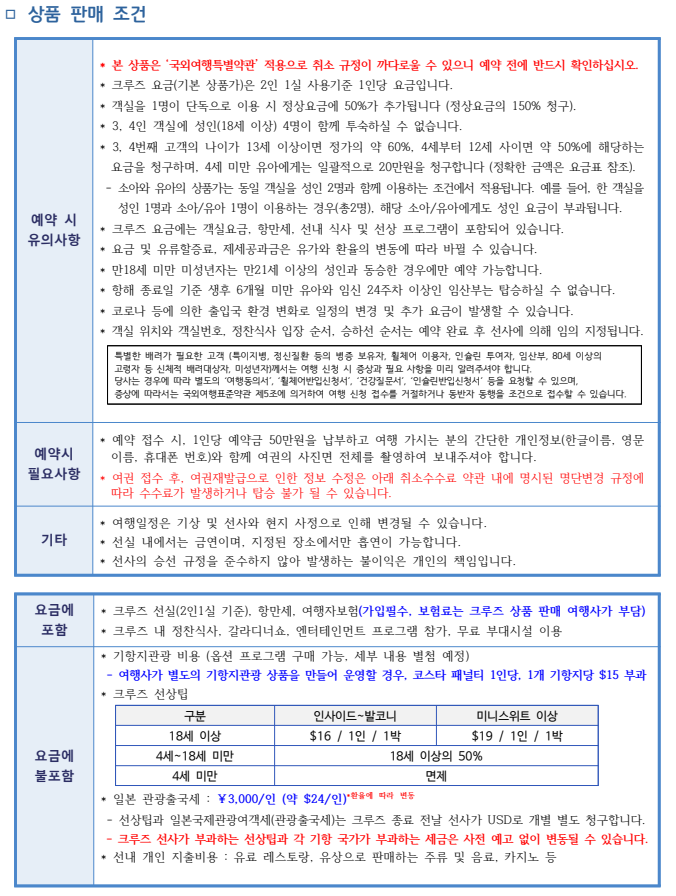 - 여행 일정은 계약 체결 시 예상하지 못한 부득이한 사정 등이 발생하는 경우 여행자의 사전 동의를 거쳐 변경될 수 있음을 양지하여 주시기 바랍니다.